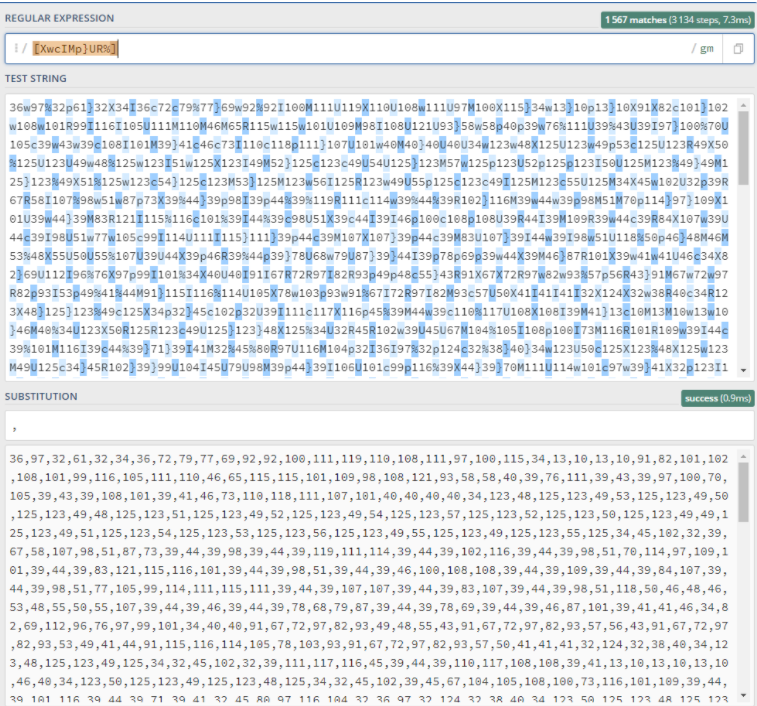 앞에 오는 문자열 중 X, w, c, I, M, p, }, U, R, % 에 해당하는 문자를 모두 제거하고 나온 결과물인 int(정수형 숫자)값들을 전부 char(문자형)으로 변환해라.
