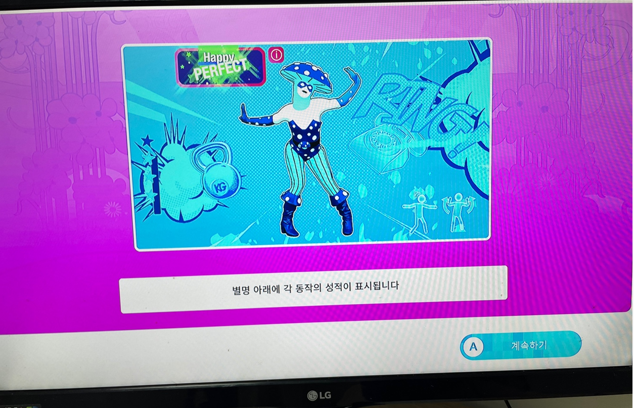 저스트댄스는 오른쪽 손으로 조이스틱을 잡고, 화면과 거울모드로 춤을 춰야 점수를 받아요!