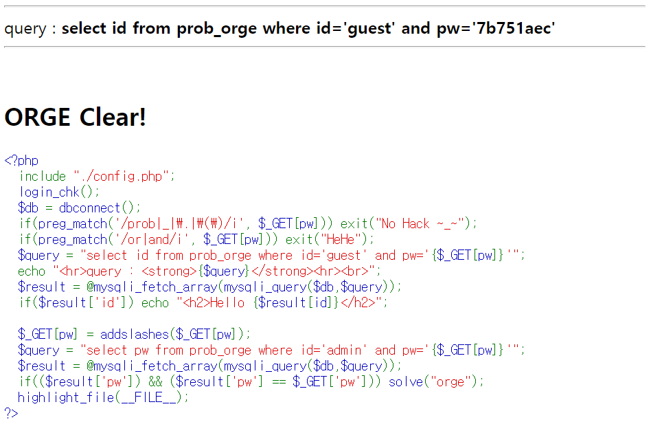 if(($result['pw']) && ($result['pw'] == $_GET['pw'])) solve("orge");