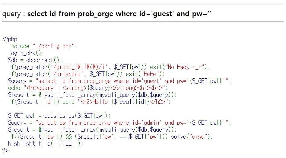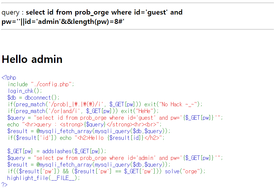 $query = "select pw from prob_orge where id='admin' and pw='{$_GET[pw]}'";