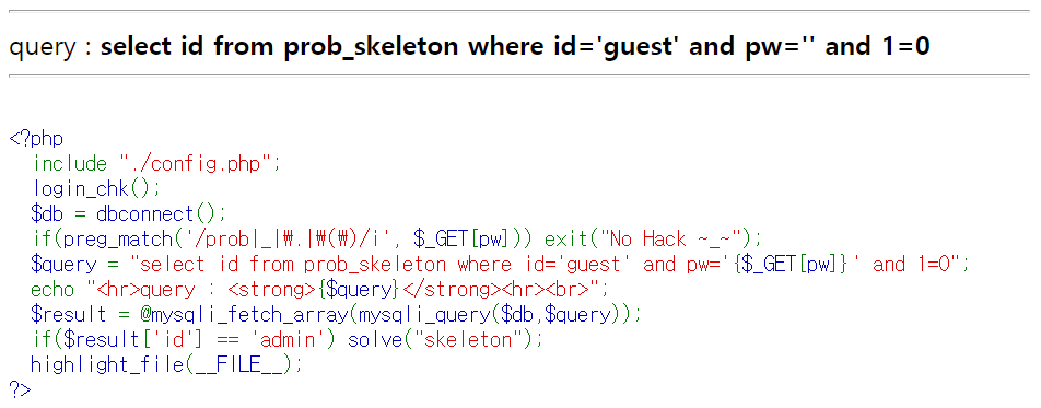$query = "select id from prob_skeleton where id='guest' and pw='{$_GET[pw]}' and 1=0";