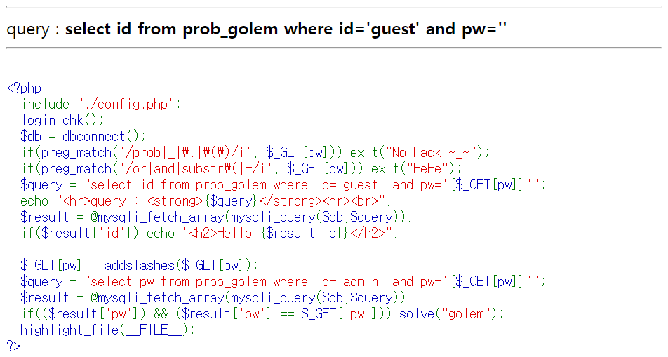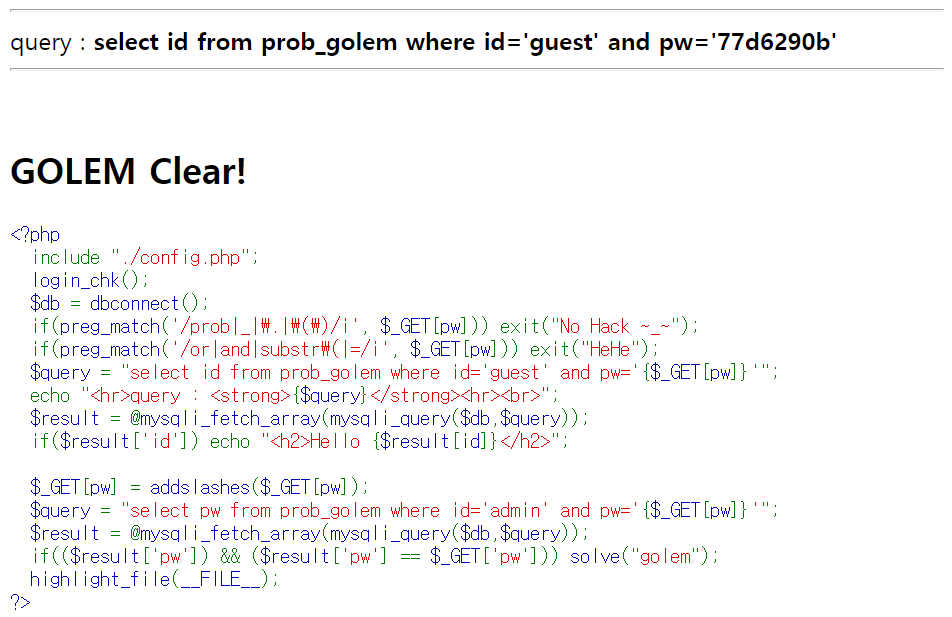 그리고 여기서부터는 addslahes 함수로 인해 sql injection 에 사용된 특수문자들이 백슬래시가 붙어 필터링이 되게 됩니다. query문을 보시다시피 pw 파라미터에 입력된 패스워드 값이 admin 의 pw 값과 정확히 일치해야지 golem 문제가 해결됨을 알 수 있습니다.