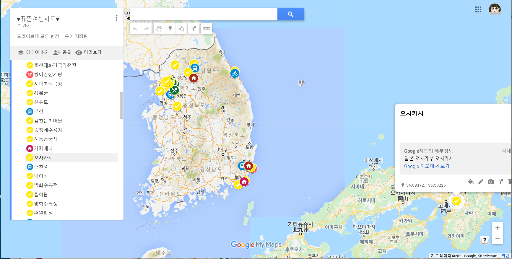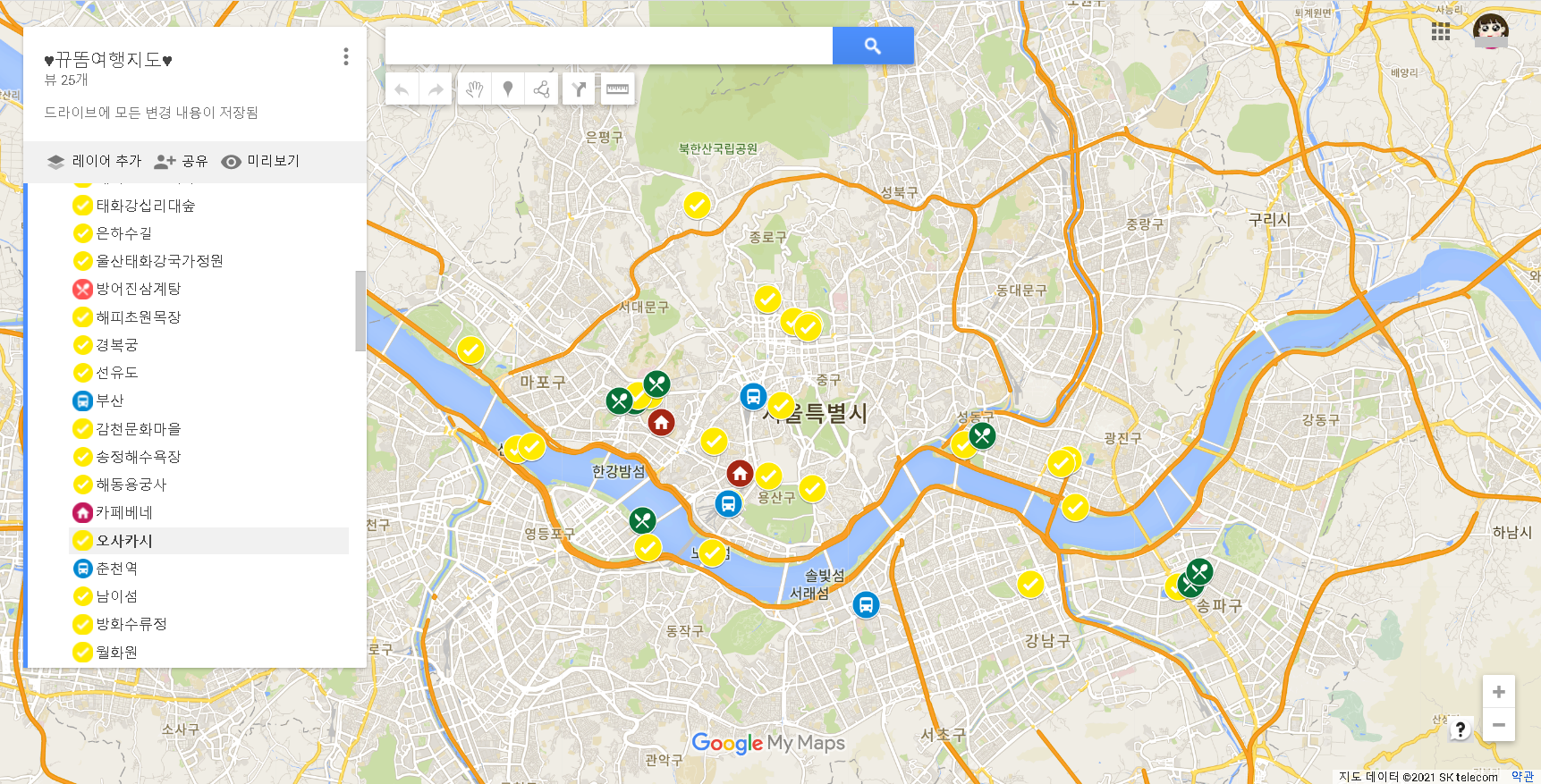 여태 남자친구와 여행갔던 장소들을 다 추가하고 나니