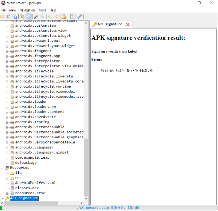jadx 툴로 apk 를 먼저 분석해보았습니다. 들어가자마자 보이는 건 APK 서명이 없었습니다.