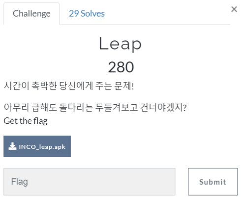 확인 해보니 Flag 값처럼 보여서 INCO{l00K b3F0r3 Y0U l3^p} 라고 입력해보았더니 문제가 풀렸습니다.