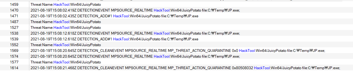 2021-08-19T15:08:02.419Z DETECTIONEVENT MPSOURCE_REALTIME HackTool:Win64/JuicyPotato file:C:\Temp\JP.exe;