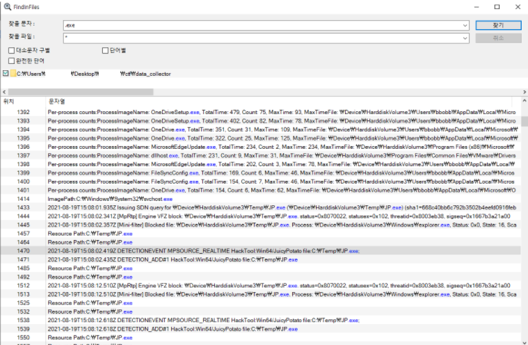 검색된 파일 경로가 보니깐 Windows Defender 디렉토리입니다. 여기서 로그가 찍혔나봅니다.
