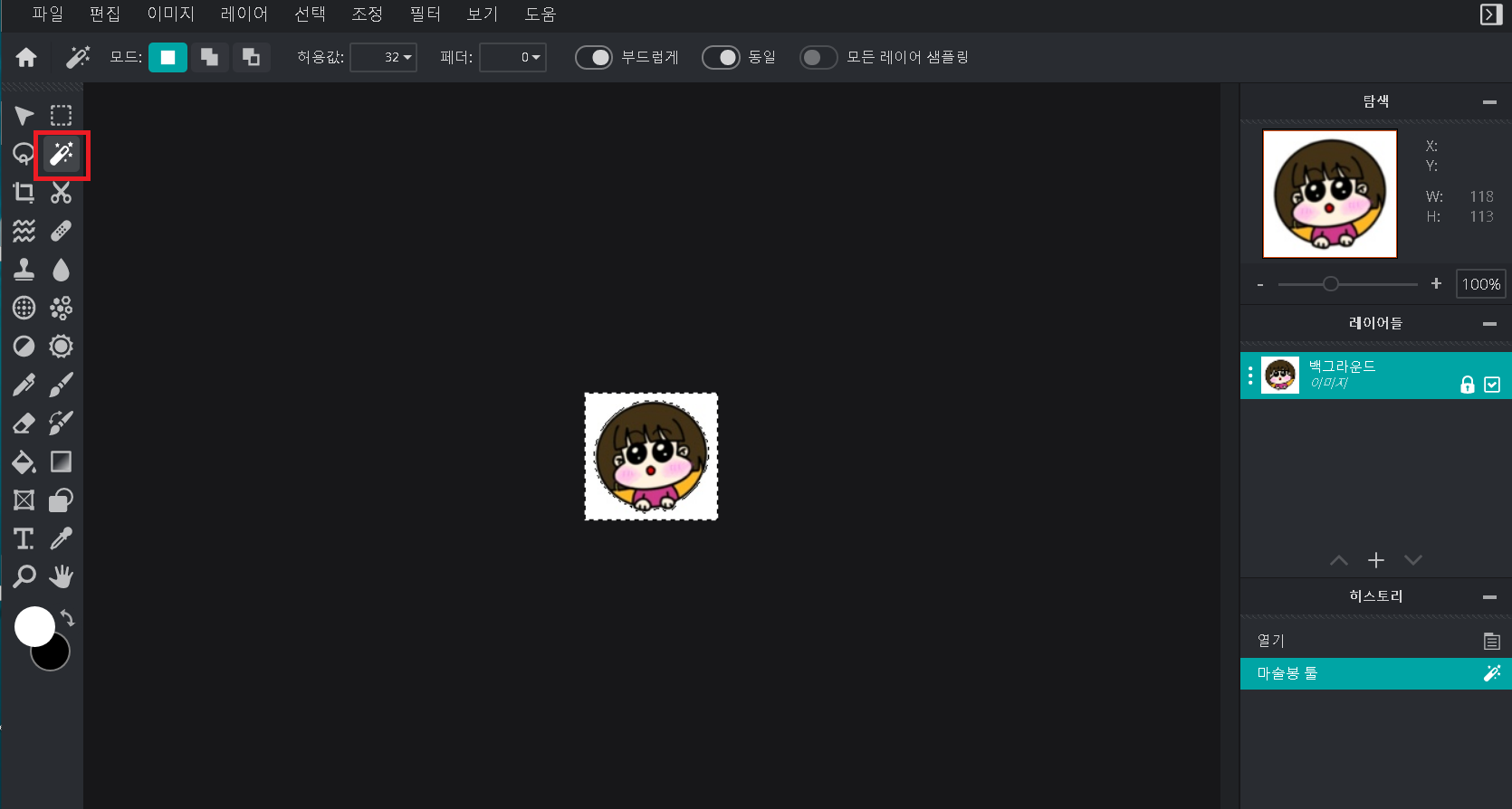 이미지에서 투명하게 지우고싶은 곳을 클릭하면 지워질 영역에 점선이 생겨요.
