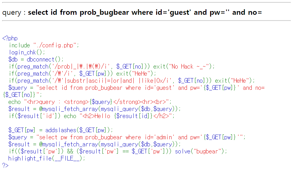 $query = "select id from prob_bugbear where id='guest' and pw='{$_GET[pw]}' and no={$_GET[no]}";