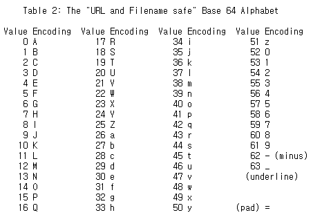 다시 62, 63, pad 부분을 살펴보십시오. 아까 +와 / 이었던 것이 -(빼기기호)와 _(언더바) 가 되었습니다. 하지만 = 는 그대로인데 그 이유는 URL 에서 어쩌피 padding은 제일 마지막 부분에 위치하기 때문에 브라우저에서 자동으로 그것을 특수한 제어문자로 인식하지 않고 URL 인코딩해서 %3D가 될 것이기 때문입니다.