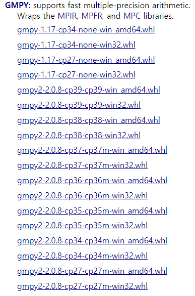 만약 파이썬 버전이 3.9 라면 cp39 를 다운로드하시면 됩니다. gmpy 를 설치할 것인지 gmpy2 를 설치할 것인지도 고르셔서 다운로드 하시면 됩니다.