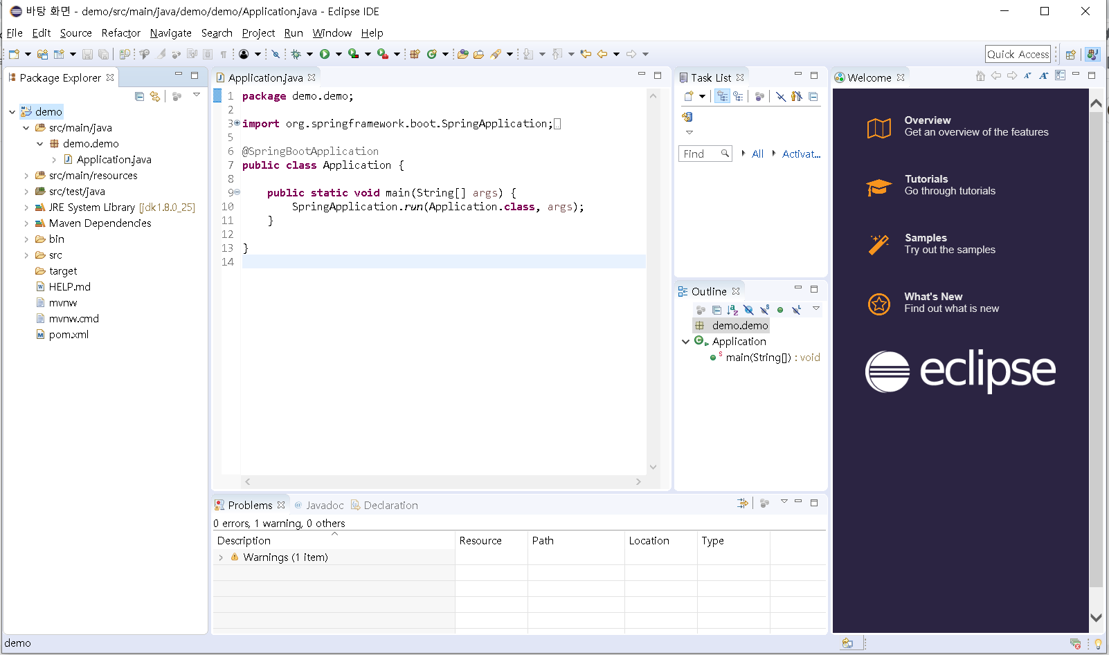 로딩이 끝나면 왼쪽 Package Explorer에서 생성한 프로젝트를 볼 수 있어요.