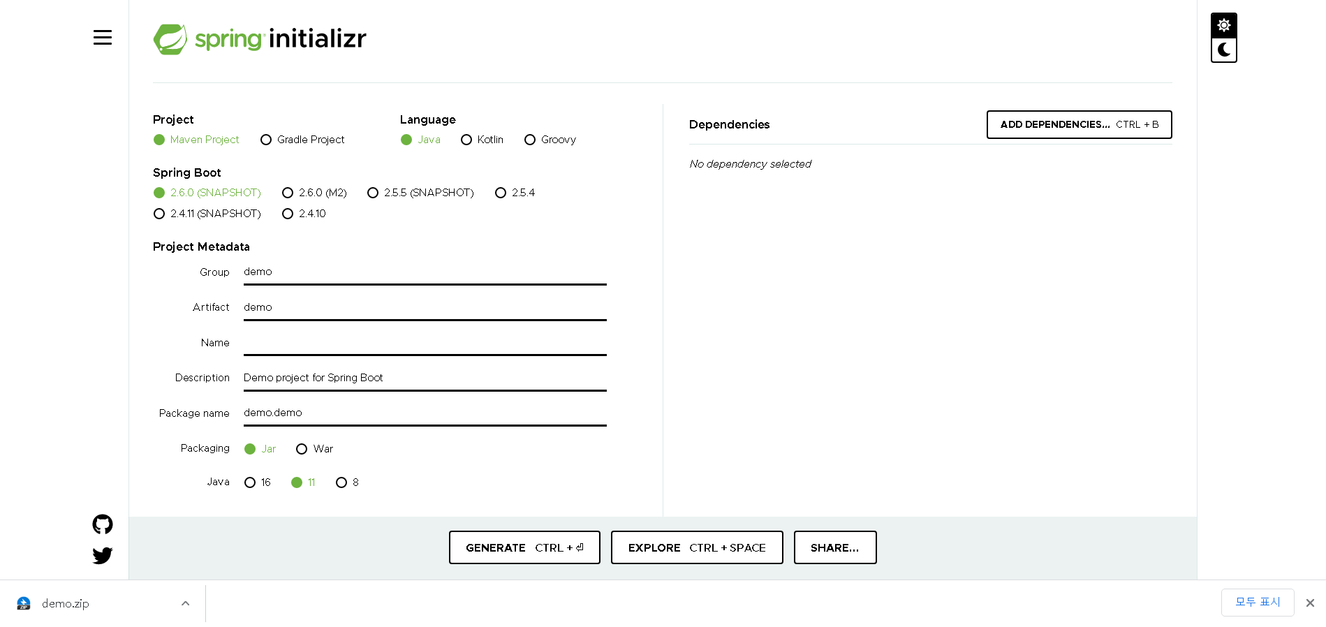 원하는 Spring Boot와 Java의 버전을 선택 후