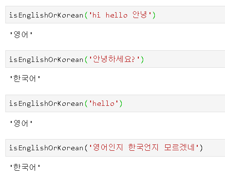 이제 문장을 isEnglishOrKorean 함수의 파라미터로 넣어주면