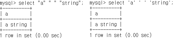 mysql> SELECT "hello", "'hello'", "''hello''", "hel""lo", "\"hello";
