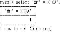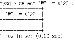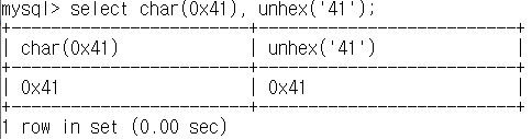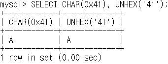 참고로 mysql client 프로그램에서 --binary-as-hex 옵션이 켜져있을 경우에는 아래와 같이 hex 문자를 unhex 했을 때 해당 옵션이 자동으로 binary 문자 값은 hex로 변환하여 hex 값 그대로 나오게 됩니다. (char와 unhex 함수 모두 hex 값을 문자로 변환해주는 기능을 하는 함수입니다)