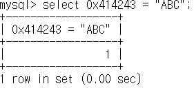 0x414243 이라는 binary set 이 "ABC"라는 문자열과 일치하여 1(True/참) 값이 나온 걸 볼 수 있습니다.
