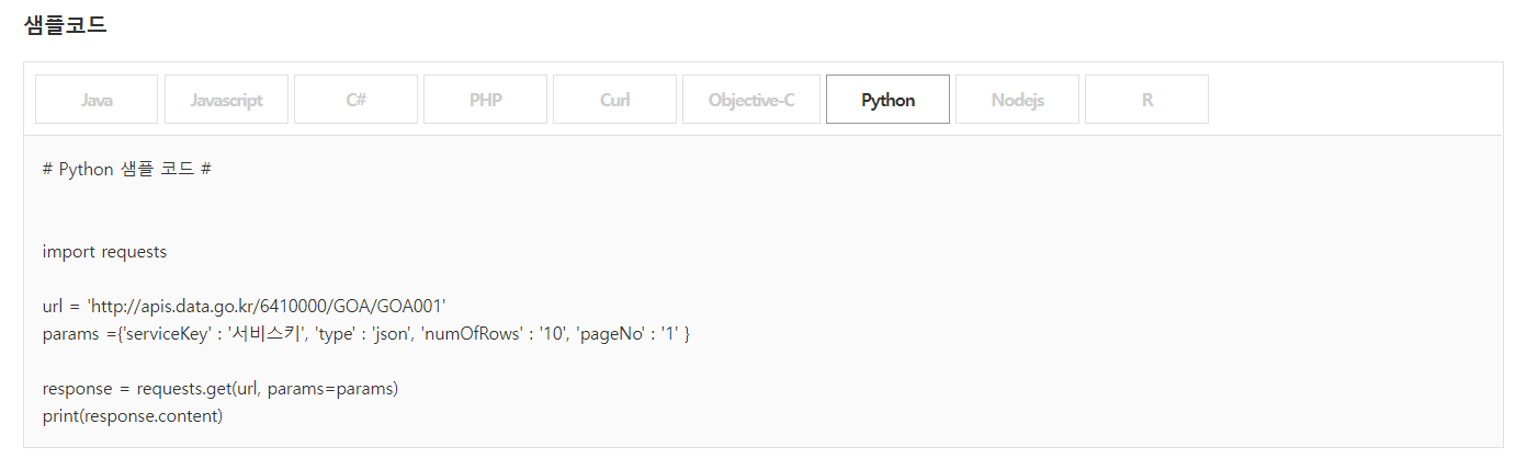 샘플코드에는 이 데이터들을 여러 프로그래밍 언어로 호출할 수 있도록 예제 코드가 적혀있죠.