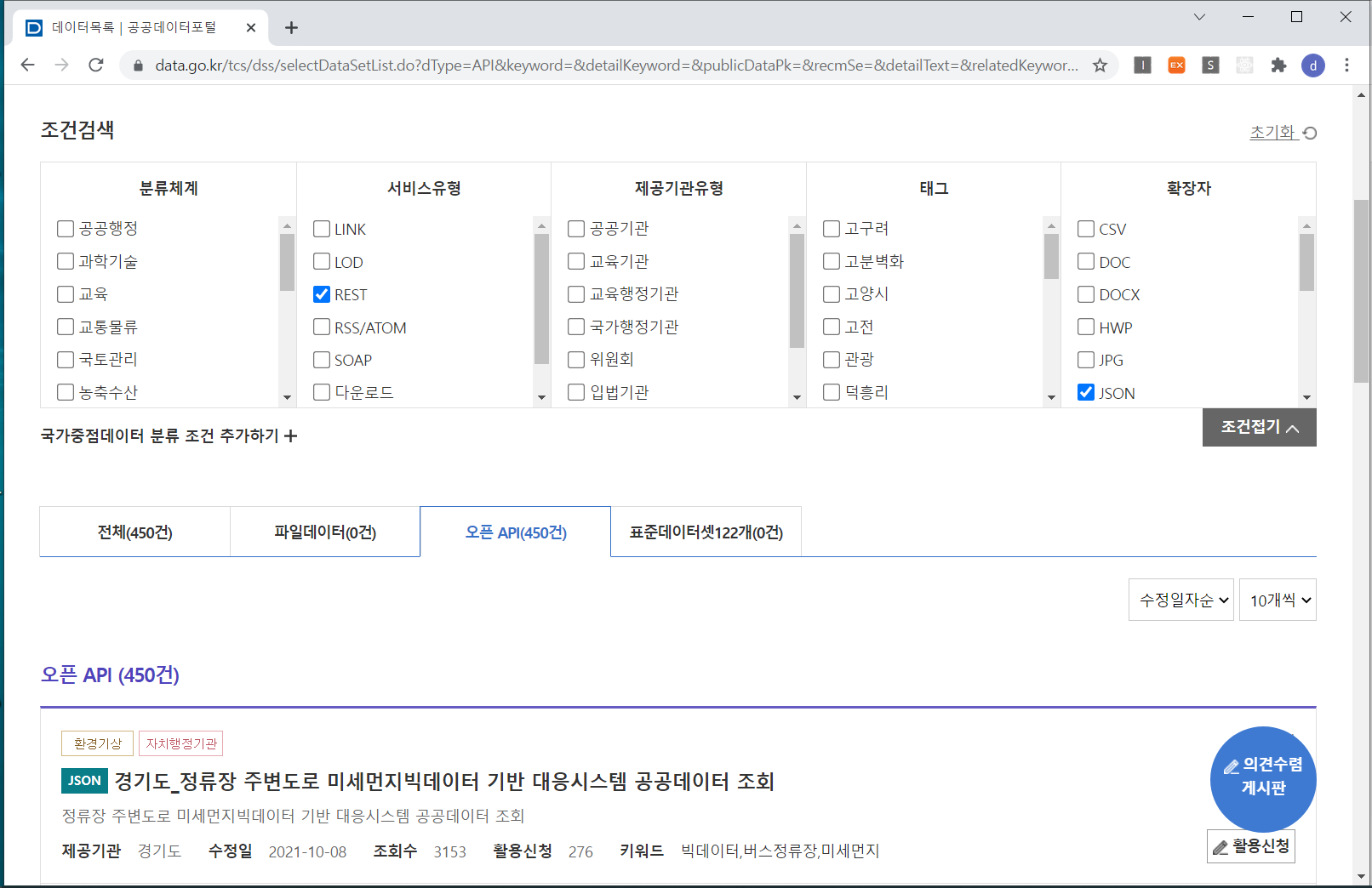 오픈 API 탭을 누르니 450건이 검색되었네요.