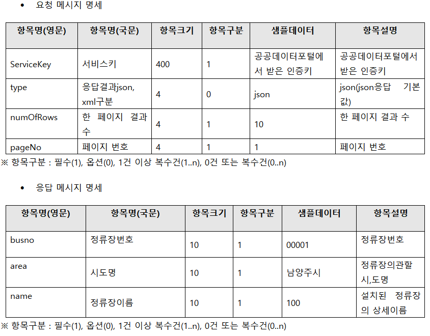 그 아래에는 아까 API 상세페이지에서 봤던 요청변수와, 출력결과 표가 있네요.