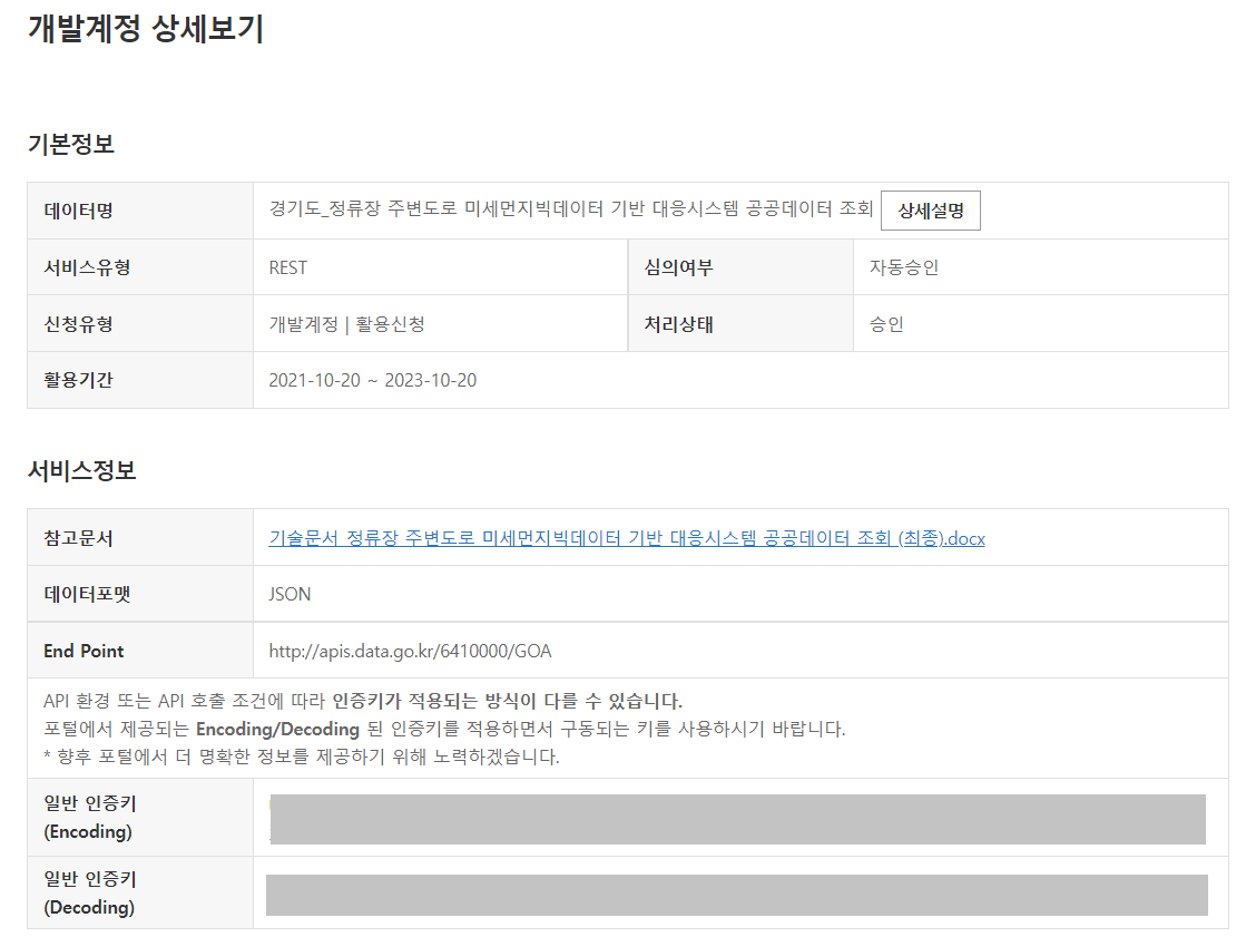 일반인증키(Encoding)와 일반인증키(Decoding) 두개를 다 사용해보면서 구동되는 키를 사용하라고 적혀있었으니