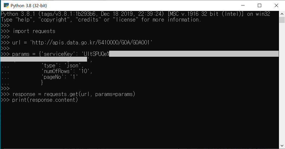 이제 요청/응답 메시지 예제에 있던 URL에 발급받은 인증키를 넣어서 고대로 API를 호출해볼게요.
