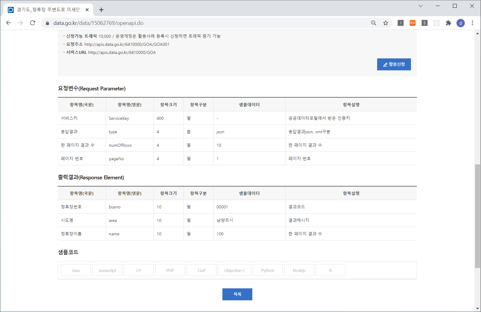 요청변수와 출력결과, 그리고 샘플코드가 있어요.