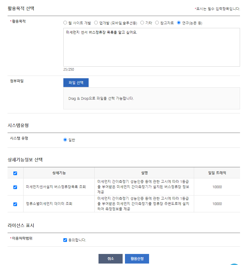 필수 입력항목들을 모두 입력해주시고, 활용신청 버튼을 누릅니다!!
