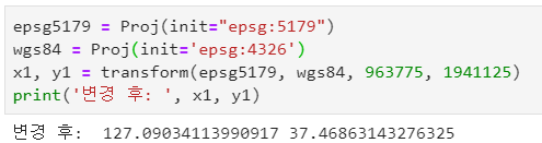 x1, y1 = transform(epsg5179, wgs84, 변경하고자하는 x값, 변경하고자하는 y값)
