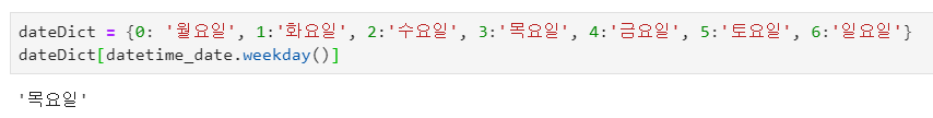 dateDict = {0: '월요일', 1:'화요일', 2:'수요일', 3:'목요일', 4:'금요일', 5:'토요일', 6:'일요일'}