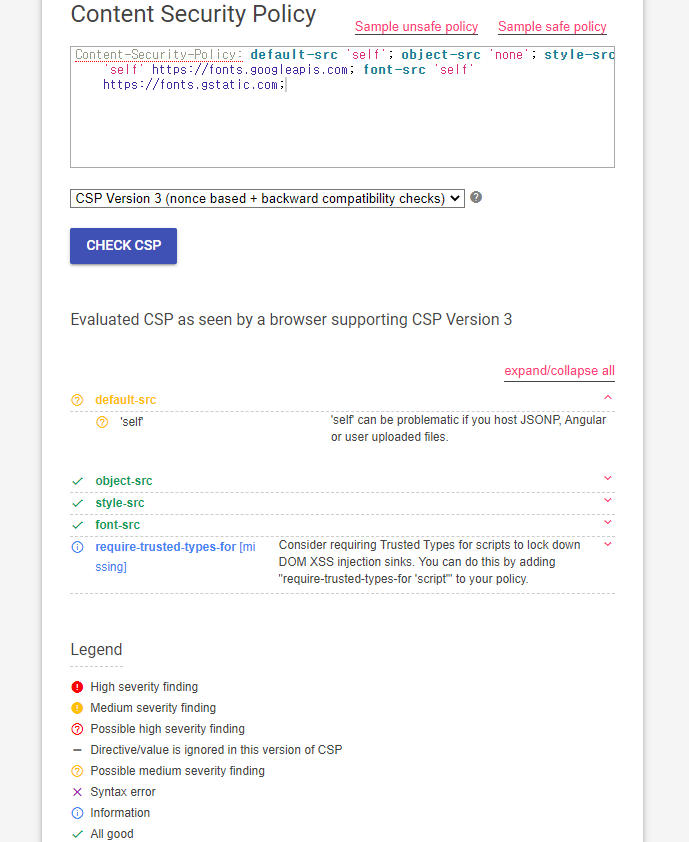 그리고 아래는 위 내용을 복사해서 CSP Evaluator 에 넣은 모습입니다.