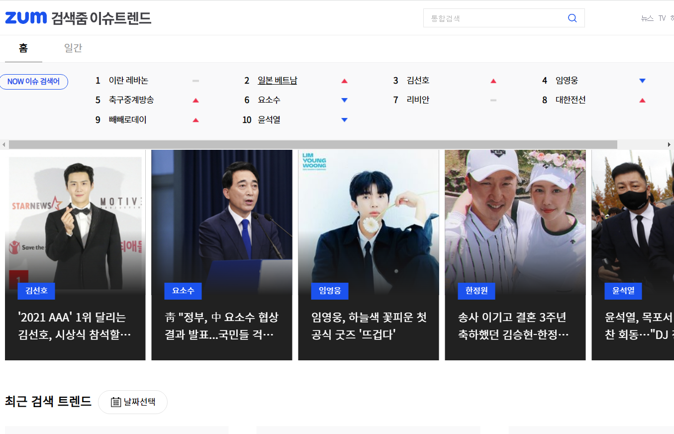 최근 실시간 검색어와 이슈를 한 곳에, 줌 이슈트렌드에서 검색어 트렌드를 확인해 보세요.