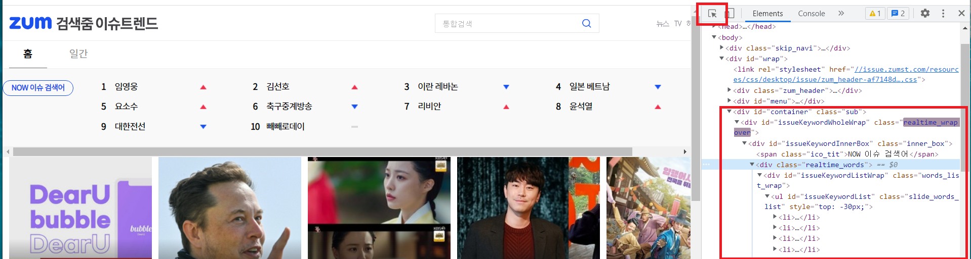 realtime_words div 안에 issueKeywordListWrap라는 id를 가진 div가 있고,