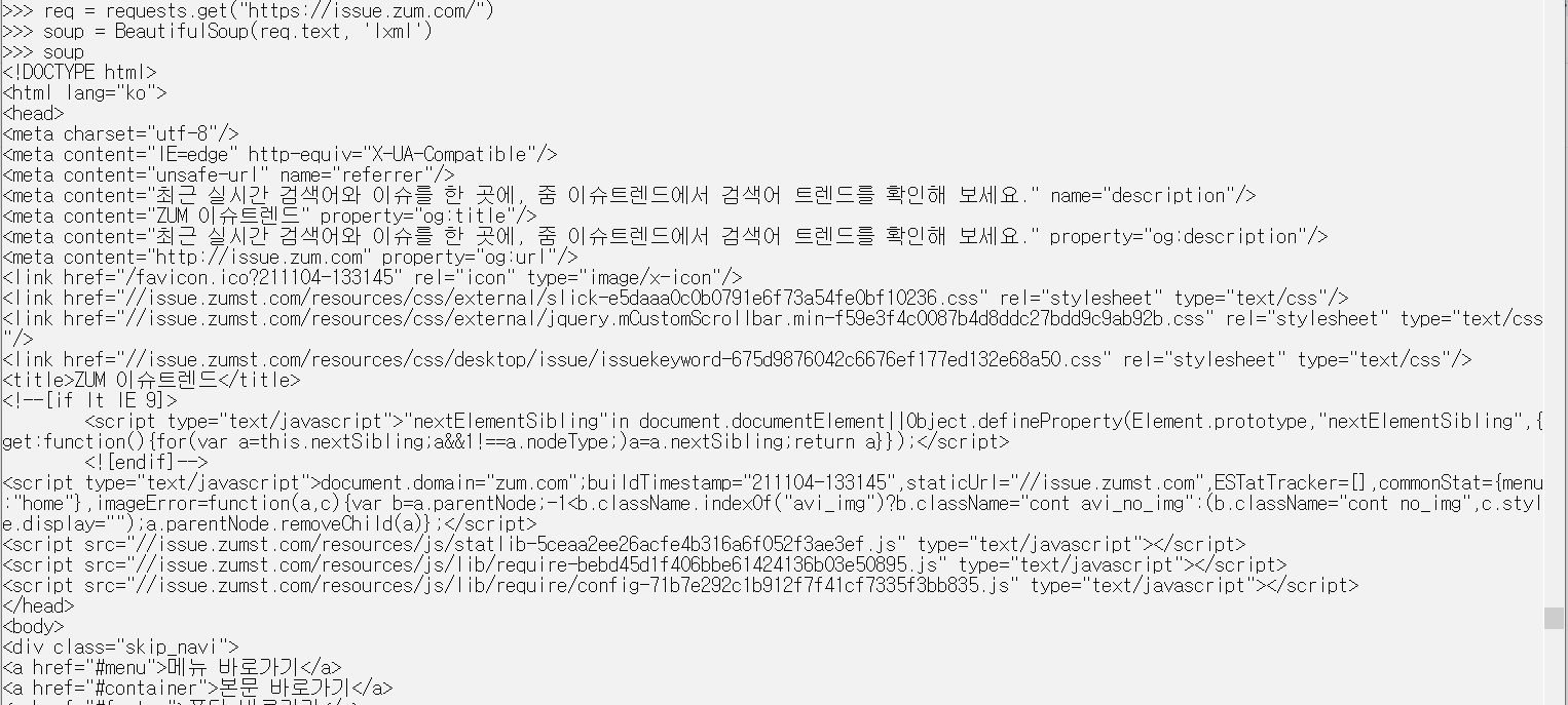 soup을 프린트해보면 아래와 같이 정상적으로 가져와 진 것을 확인할 수 있어요.