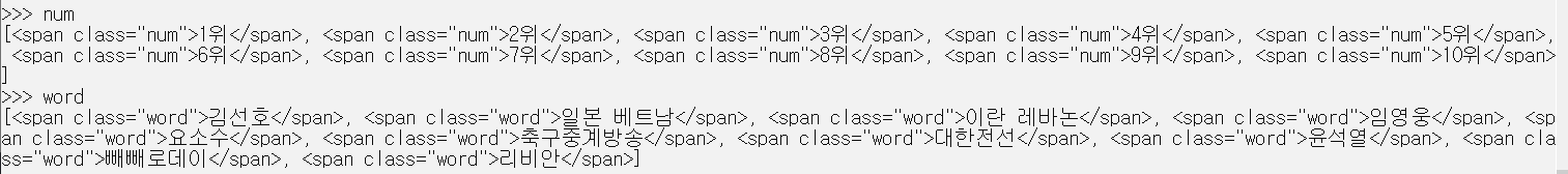 보니까 키워드들이 모두 span 태그 안에 num, word 클래스로 들어있어요.모두 findAll 해서 가져오면 될 것 같습니다.