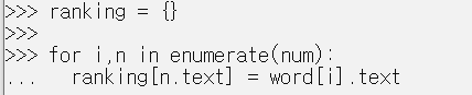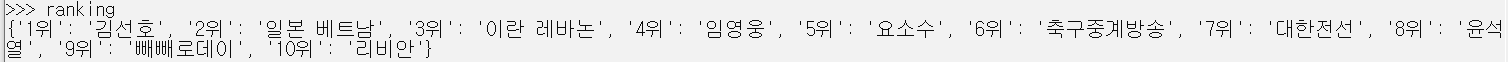 보기 좋게 ranking이라는 딕셔너리에 넣어서 출력해보았어요,