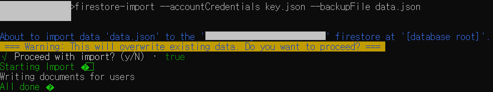 내보내기할때는 firestore-export였고, 가져올때는 firestore-import만 바꿔 입력하면 된다.