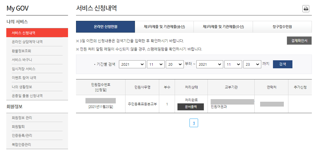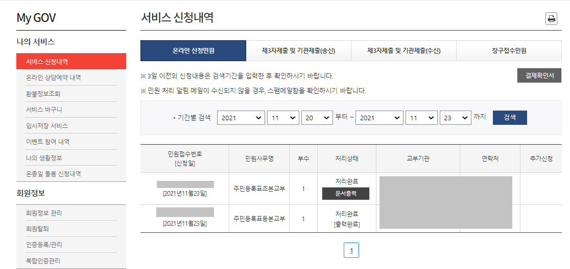 등본과 초본 모두 발급처리가 완료된 것을 확인할 수 있습니다.