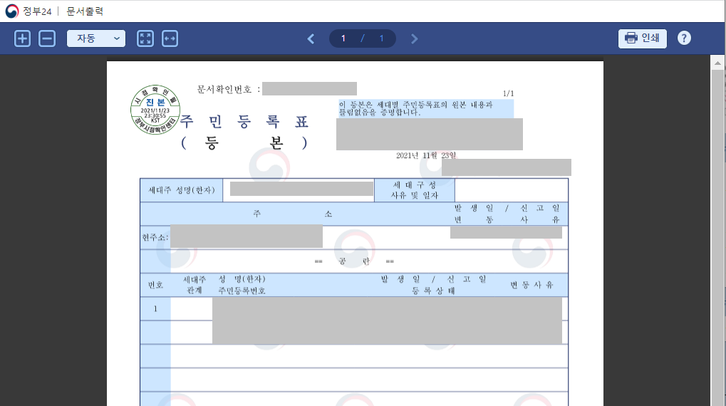 처리상태 칸에 있는 "문서출력"을 눌러 등본을 출력해봅니다!