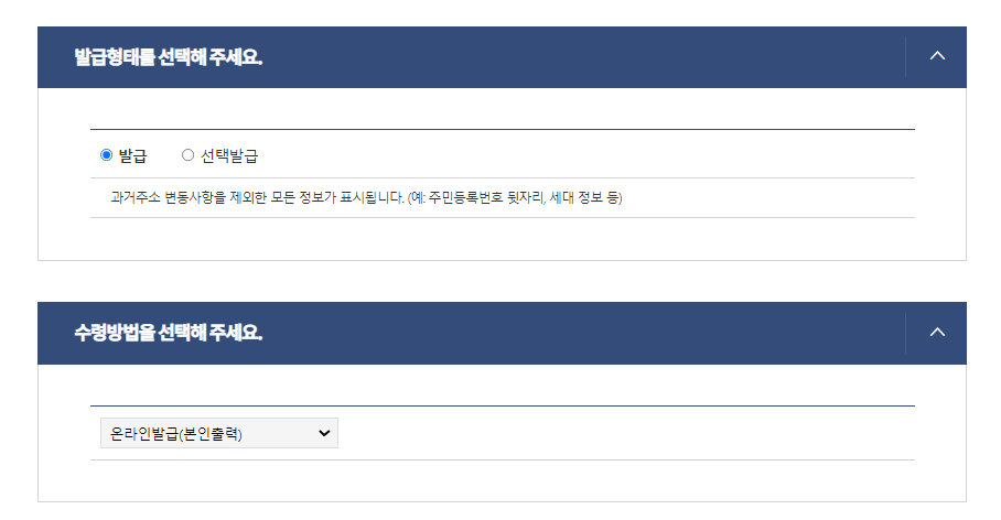 과거 주소변동사항, 세대 구성정보, 세대구성원정보, 주민등록번호 뒷자리 중 원하는 것만 선택해서 발급하려면 "선택발급"을 체크해주시면 됩니다.
