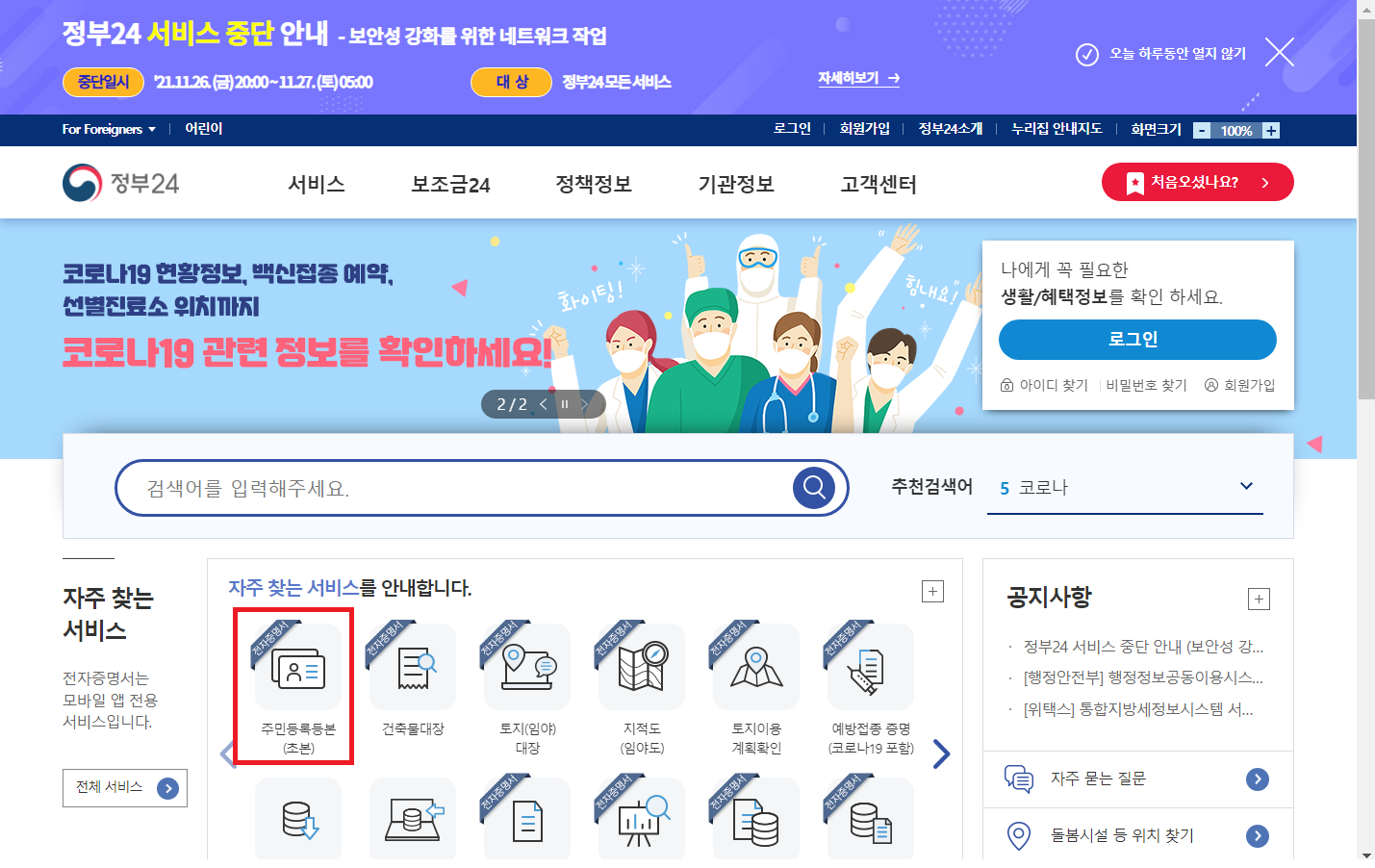 메인페이지 자주 찾는 서비스에 주민등록등본 (초본)이 있네요!