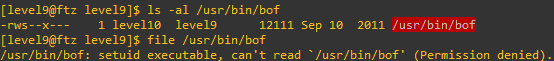 그렇기 때문에 level9 사용자로선 /usr/bin/bof 프로그램을 실행해볼 수밖에 없습니다.