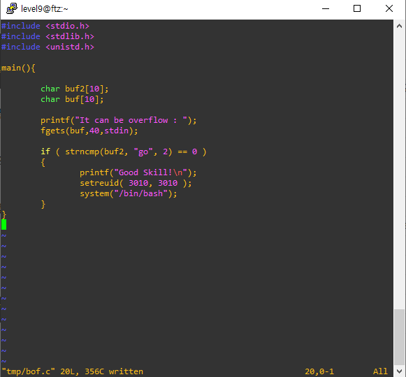 우선 힌트를 보면 위 C언어 코드로 작성되어진 /usr/bin/bof 프로그램을 실행시켜 level10의 권한을 획득하라고 되어 있습니다.