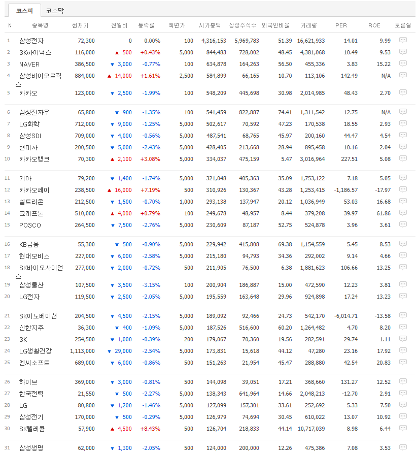 # ['N', '종목명', '현재가', '전일비', '등락률', '액면가', '시가총액', '상장주식수', '외국인비율', '거래량', 'PER', 'ROE', '토론실']