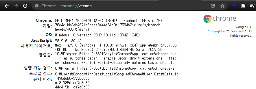 제 크롬 버전은 96.0.4664.45 버전이라고 하네요.