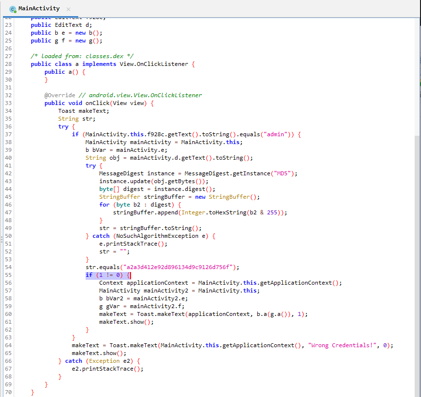 보아하니 id 가 admin 이고 pw 가 md5 hash 한 결과가 아래 if 문 안에 들어있는 hash 값과 일치하면 Toast Message 로 Flag가 나오는 것 같습니다.