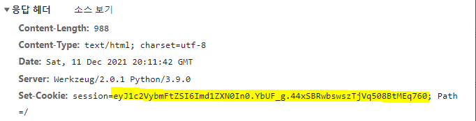 SecureCookieSessionInterface 라는 곳에서 쿠키들을 서명해주고 Flask 세션 형태의 구조로 만들어서 출력해줍니다. 그리고 바로 아래와 같은 형태가 Flask에서의 일반적인 쿠키의 형태이죠. (점을 기준으로 구분했습니다)