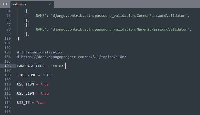 방금 봤던 config 디렉토리 하위에 settings.py 파일을 열어봅시다. 106번째 줄에 보시면 언어 설정할 수 있는 곳이 보입니다. 그리고 108번째 줄에서는 시간대도 설정할 수 있는 것 같습니다.